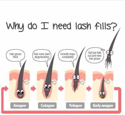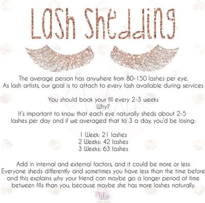 Typically, without a fill in about 5-6 weeks but they get very sparse depending on how well they are taken care of. Fill ins are recommended every 2-3 weeks for maintenance. An average person has 120-150 lashes per eye and shed 2-5 daily. EX: 3 weeks=100 lashes lost. That’s why you would need a fill in. Mascara & solvents in products break down the bond of the adhesive. Also, using ingredients such as glycols and carbonate can also break down the bond of the adhesive.